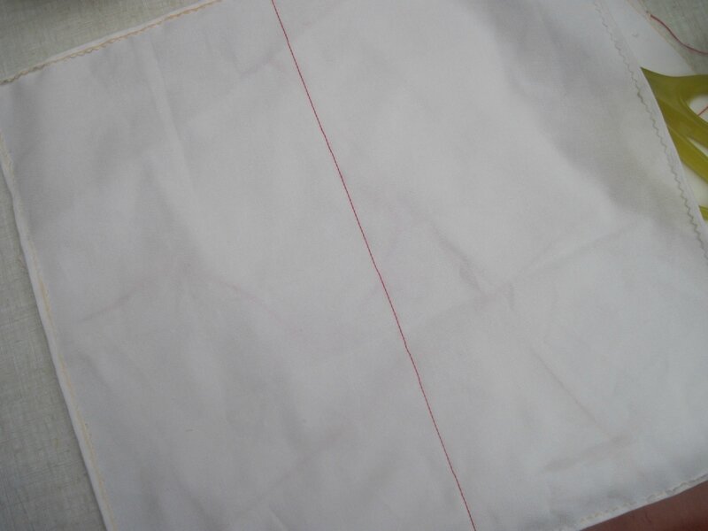 J’ai découpé des carrés de tissus blancs de 37 X 37 cm. A l’aide d’un feutre lavable, j’ai tracé les lignes de pliage et j’ai ensuite cousu un trait au fil rouge. Tout autour, j’ai fait un bord au fil blanc.