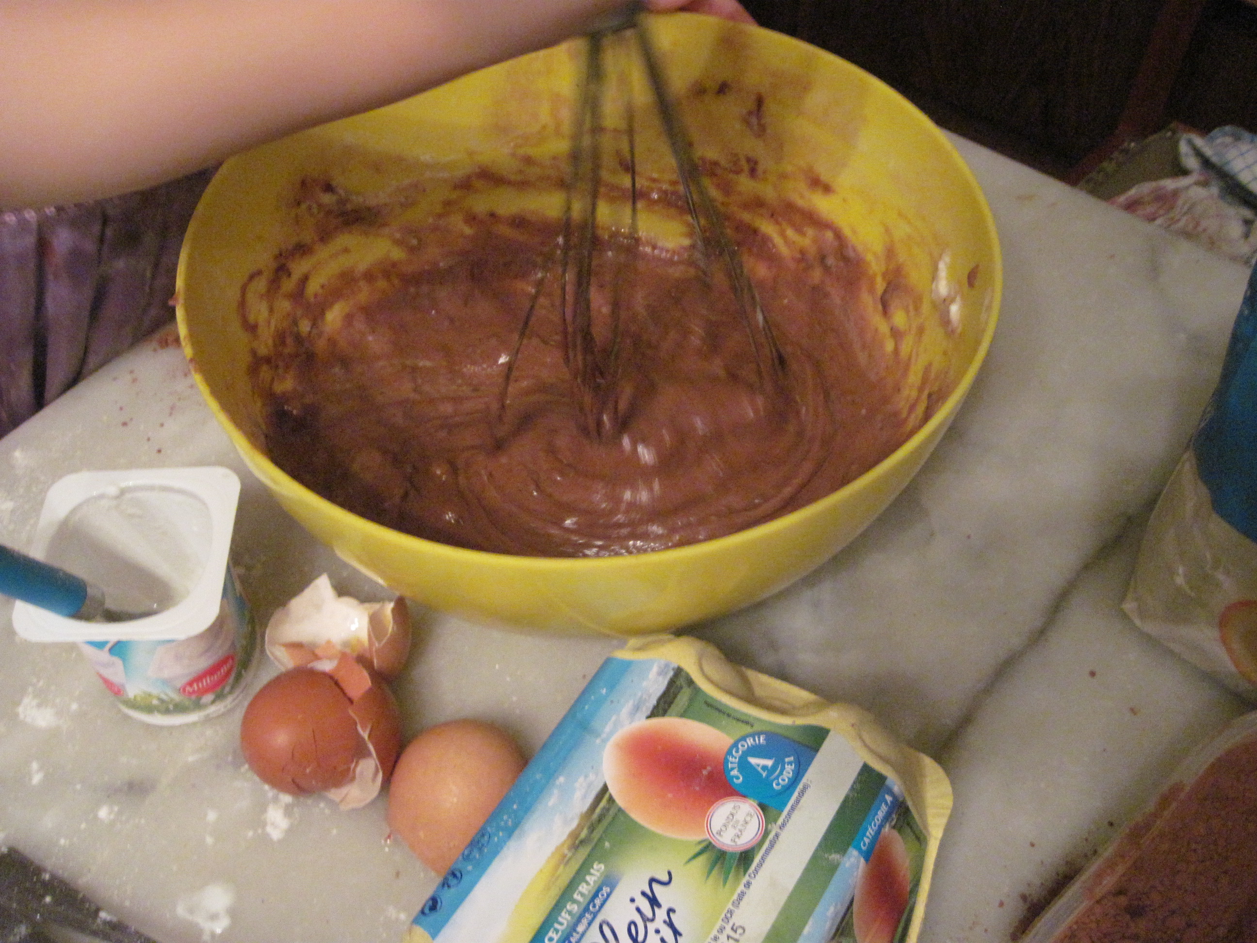 On met les yaourts dans un saladier, on ajoute le sucre, la farine, la levure, le chocolat en poudre, on mélange bien, puis on ajoute les œufs, l’huile, le sel et la vanille.